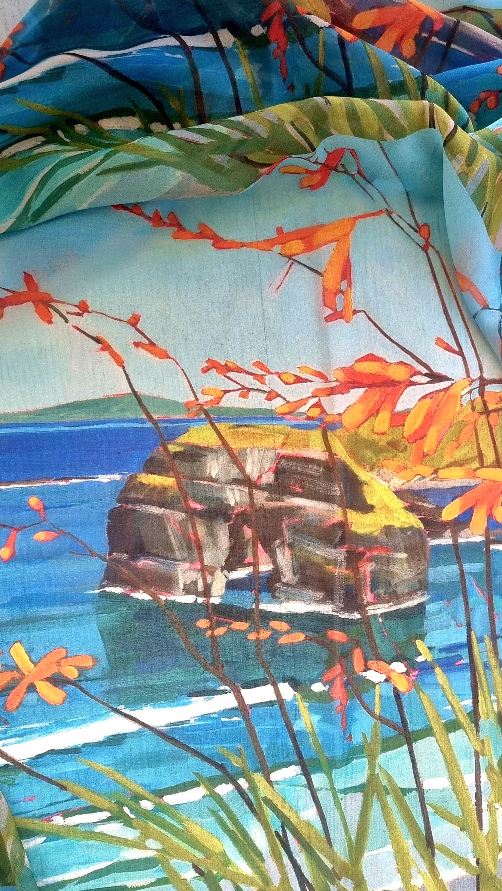 This design is based on one of my many Ballybunion artworks, capturing montbretia over the Virgin Rock on the Nuns Beach in beautiful Ballybunion!
