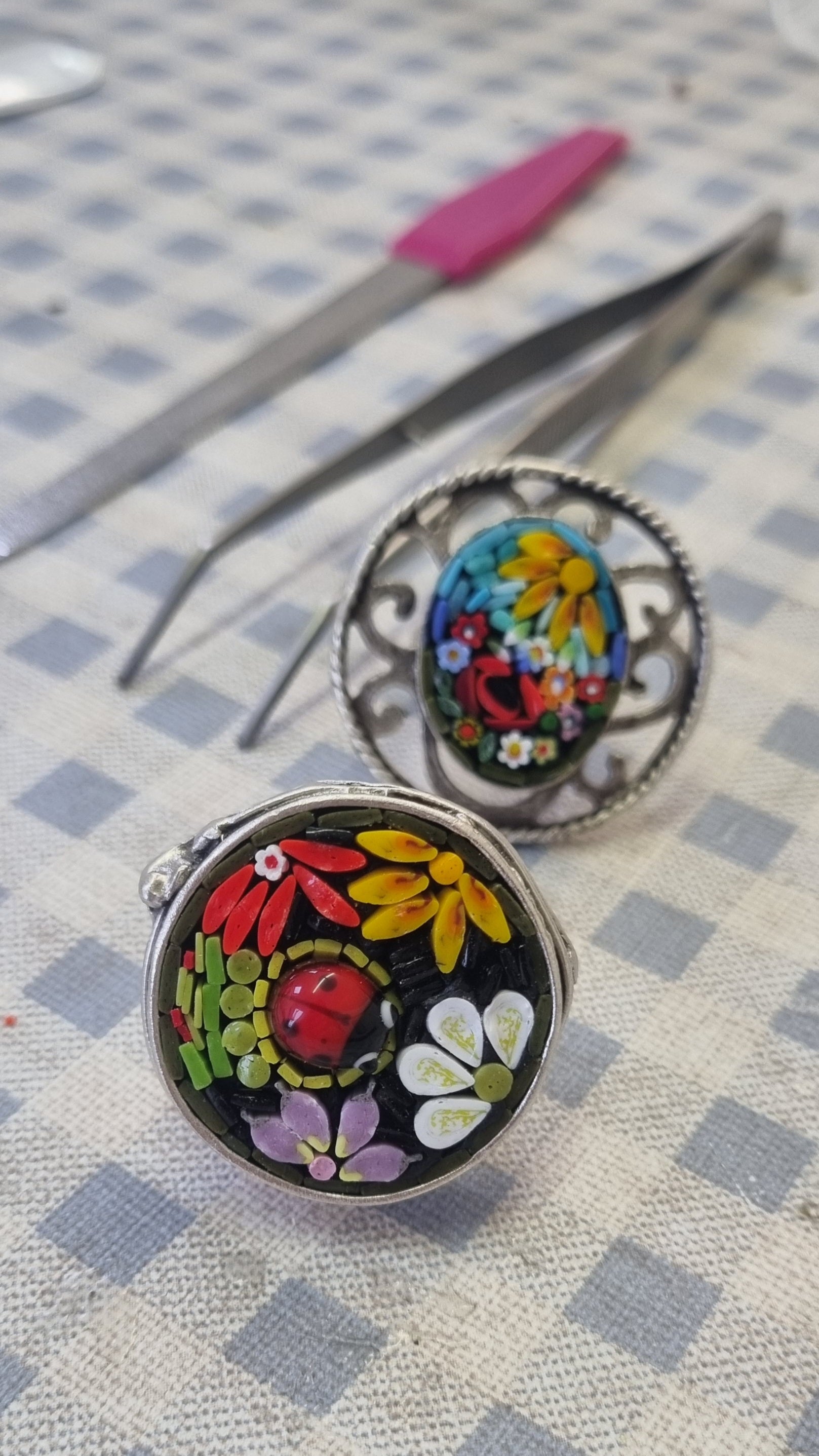 "Today was filled to the brim with creativity as I attended a micro mosaic jewellery workshop in Listowel, faciliated by Artist Olive Stack. The choices of bezels for pendants and rings was absolutely fantastic and the choice and colours of the filati glass was unbelievable! We were really spoilt, so thank you Olive. I'm thrilled with both of my bespoke micro mosaic dress rings. The tiny fused glass ladybird in the circular ring, I bought about 15 years ago in the Hunt Museum, Limerick. It's been sitting on my kitchen window sill all these years waiting for a good home and today I found it. A workshop that I would highly recommend!"