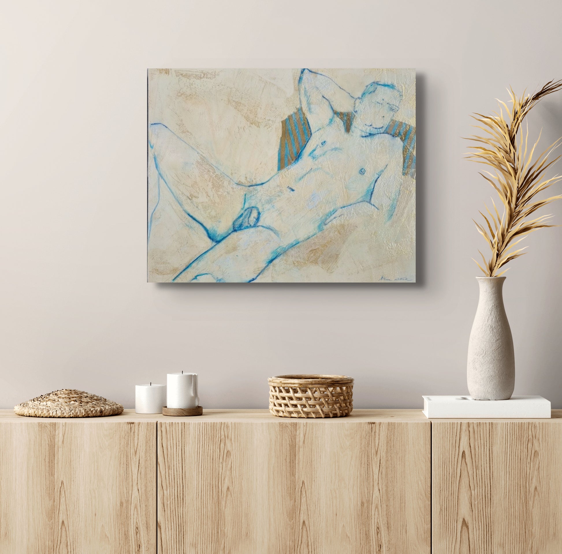 This painting explores the expressive potential of the human form through the depth, texture, and translucency unique to this medium. The process allows for both spontaneity and control—sculpting with wax, embedding materials, and carving into the surface—all of which contribute to the emotional resonance.